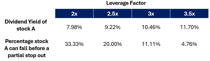 - In the table below, you can see that even though a higher leverage factor increases your dividend yield of Stock A, it can also increase your risk of a partial stop out should the stock price falls. Ultimately, it is important to pick the appropriate level of leverage that suits your risk appetite.