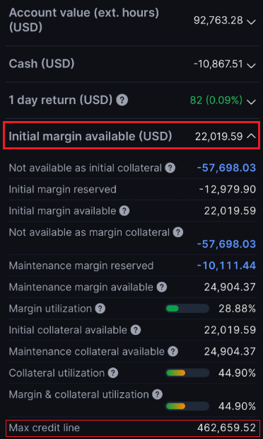 The total amount you can borrow depends on the collateral value of eligible assets in your account and cannot exceed the Max Credit Line (MCL), which is the maximum loan amount available to you.