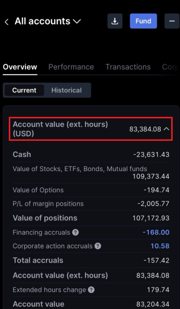 You can find your Account value in multiple locations. You can find it under Portfolio > Select one account or All accounts > Overview: