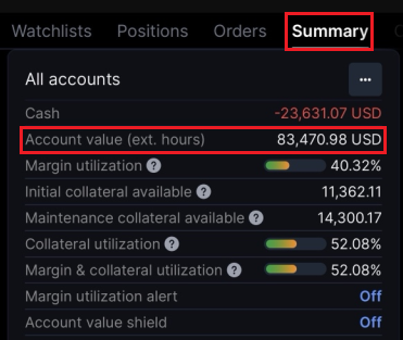 Please be aware that the Value of positions in your Account details might differ from the number shown in the Positions module. This can happen because Account details show real-time values, while the Position module might use delayed pricing based on your market data subscription.