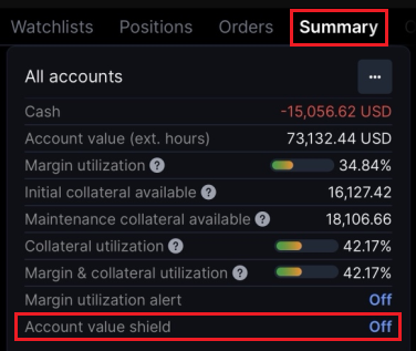 To set up an account value shield, go to Trading > In the bottom under the Positions module, see Accountvalueshield > Click Off
