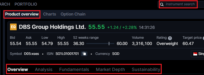 Switch between Overview, Analysis and Fundamentals to find information such as consensus, key stats (EPS, P/E, Dividend Yield,...), financials (Revenue, EBITDA,...) or read news around the company or the sector.