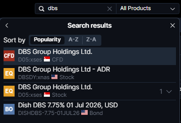 Please be aware that searching across all products may yield results from various product categories (such as equities, CFDs, bonds, etc.) with similar names, as well as listings from different exchanges.