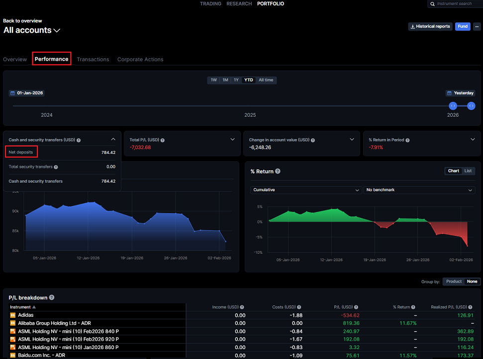 You can see the development of your account value and returns in two charts. For the returns chart, you can add a benchmark to compare the performance with. You can also see the profit loss breakdown with the possibility of grouping by product. By clicking on an instrument, you can get more insights on the earnings, returns and transactions history for the instrument.