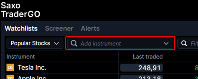 You can add an instrument to a watchlist in the Watchlists tab by searching for an instrument in the search bar.