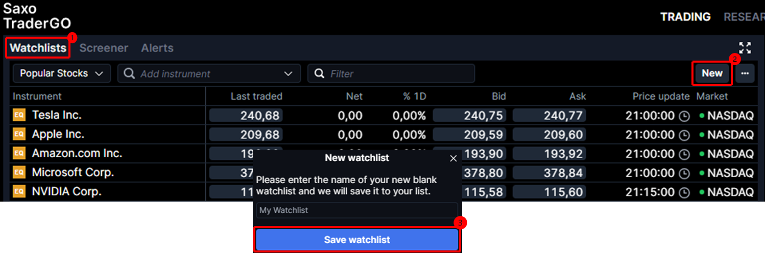 As an example, If you get good investment ideas from a podcast or an article in our platform and want to keep track of a few stocks, log in to your Saxo account, search for those stocks and add them to a watchlist.