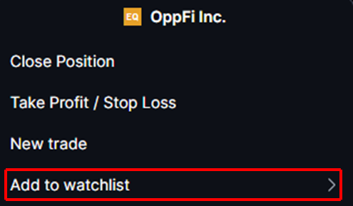 You can also add an instrument from the Positions module by right clicking on an instrument and then click Add to watchlist.