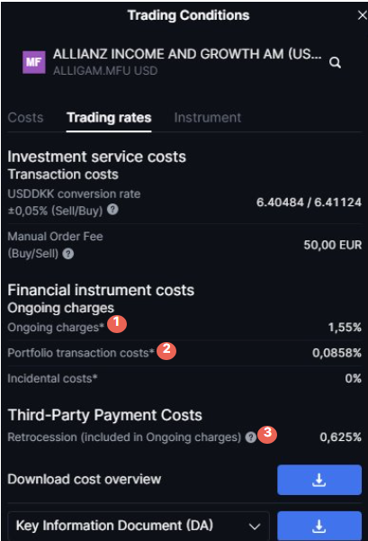 You can find the trading conditions connected to a specific mutual fund by clicking on > Trading rates or Costs.