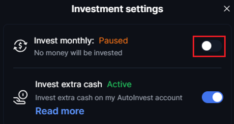 You can also pause your AutoInvest by navigating to Portfolio > Choose your AutoInvest account > Click the three dots in the top-right corner > Click Investment settings > Pause AutoInvest by deactivating Invest monthly.