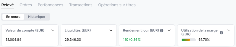 Dès que vous utilisez des produits pouvant entraîner une perte supérieure au montant investi, une marge sera calculée. Dans l’écran d’aperçu de votre portefeuille, un encadré supplémentaire apparaîtra affichant l’utilisation de la marge sous forme de pourcentage.