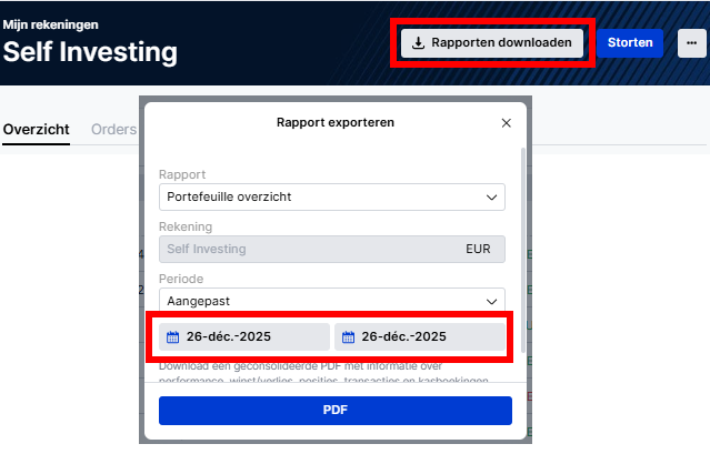 Chez Saxo, vous pouvez retrouver très facilement tous les types de rapports, pour n’importe quelle période ou date. Sur le site web, vous verrez toujours en haut, dans la barre bleu foncé, le bouton « Télécharger les rapports ». Vous pouvez ensuite demander un aperçu de portefeuille pour une période donnée ou pour un jour précis, par exemple le 1er janvier 2026.