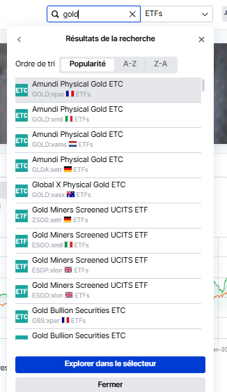Tous les ETF (ETC) sur matières premières ne sont pas disponibles sur la plateforme Saxo, et vous remarquerez parfois un point d’exclamation orange à côté. Vous pouvez uniquement acheter des ETC présentant des caractéristiques de risque moyen ou faible. Vous trouverez ici plus d’informations sur la raison pour laquelle nous ne proposons pas d’ETC à haut risque. Très souvent, il existe des alternatives sans point d’exclamation. Dans l’exemple ci-dessous, nous recherchons des ETF dont le nom contient « Gold ». Vous pouvez poursuivre votre recherche ou consulter les détails des ETC en cliquant en bas sur le bouton bleu « Explorer dans le sélécteur ». |