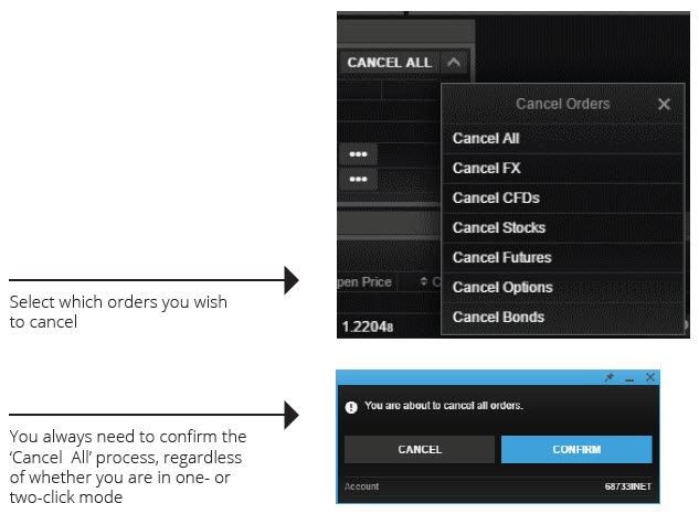 La fonction "Annuler tout" du module d'ordre vous permet d'annuler tous les ordres, ou seulement ceux d'une catégorie d'actifs spécifique, en quelques clics :