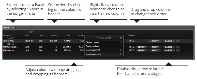 Le module d'ordres affiche tous les ordres en cours qui doivent encore être exécutés. Les images suivantes décrivent le module dans SaxoTrader desktop