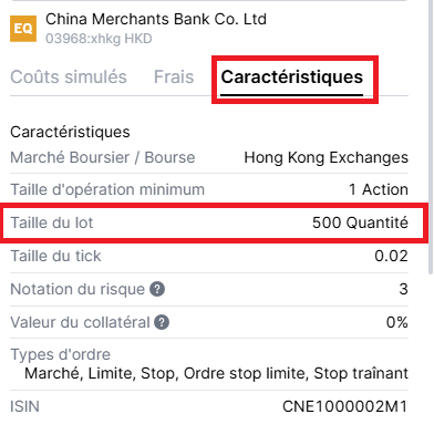 Sur la plateforme, vous pouvez consulter la taille du contrat sous l’onglet « Conditions de trading & coûts » (cliquez sur l’icône « i » à côté de l’instrument) :