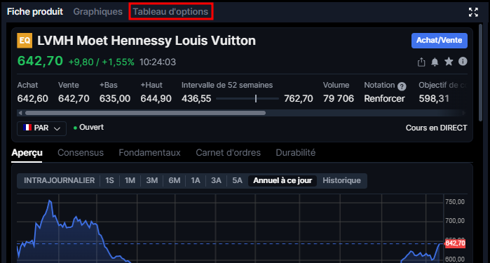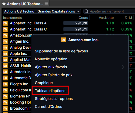 Visualisation de le tableau d'options dans SaxoTraderGO