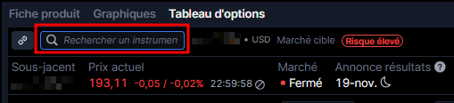 Choisissez un instrument tel qu'une action ou une paire de devises (Forex) > cliquez sur Tableau d'options et la chaîne d'options sera affichée pour l'instrument sous-jacent.