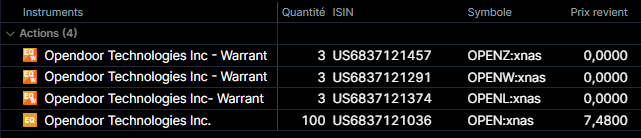 Exemple : Si vous avez 100 actions Opendoor Technologies, vous avez reçu dans votre portefeuille 3 bons de souscription de chaque série. Vous pouvez le voir dans votre portefeuille comme l'exemple ci-dessous. Vous pouvez ajouter les colonnes symbole et/ou ISIN pour rendre la différence claire.