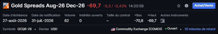 Exemple - Spreads sur l’orPour cet exemple, nous allons explorer une stratégie de spread calendaire utilisant des contrats à terme sur l’or. La stratégie consiste à négocier le spread GCQ6-Z6, qui comprend des contrats à terme sur l’or avec des dates d’échéance en août et décembre 2026. En adoptant cette approche, les traders visent à tirer parti des variations de l’écart de prix entre les deux contrats à terme ayant des dates d’échéance différentes. L’objectif est de profiter du mouvement relatif des prix entre les contrats d’août et de décembre, plutôt que du prix absolu de l’or lui‑même.