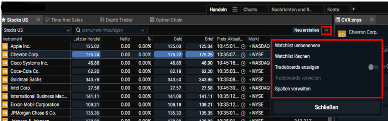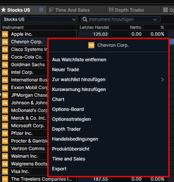 Si vous avez le bon Maustaste en cliquant sur un instrument, vous pourrez choisir parmi plusieurs options. Vous pouvez consulter les instruments de la liste de surveillance, un diagramme affiché, des instructions manuelles et bien plus encore.