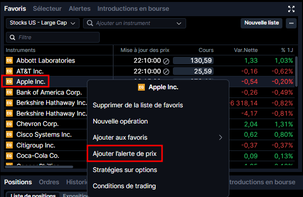 - SaxoTrader (desktop) : Menu > Alertes ou bien cliquez avec le bouton droit de la souris sur l'instrument concerné dans la liste de valeur, le panneau des ordres ou le panneau des positions, ou dans le graphique et sélectionnez Ajouter une alerte de prix.