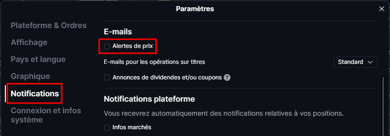 Par défaut, vous recevez une notification plateforme lorsque le niveau de prix choisi est atteint. Mais vous pouvez aussi demander à ce que ces alertes vous soient envoyées par email, pour ce faire vous devez vous rendre dans les paramètres de votre plateforme :