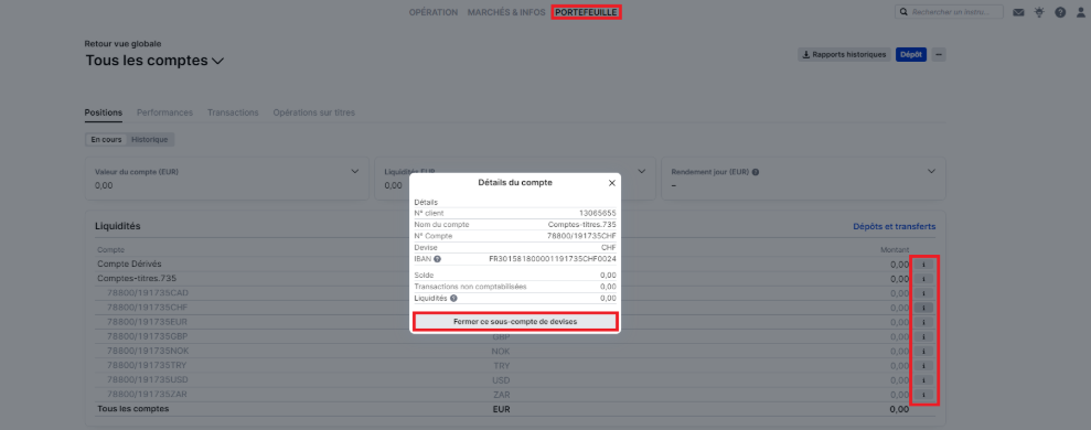 Pour clôturer votre sous-compte, il ne doit pas y avoir de positions ouvertes, d'ordres, d'opérations sur titres en cours ni de solde en espèces.