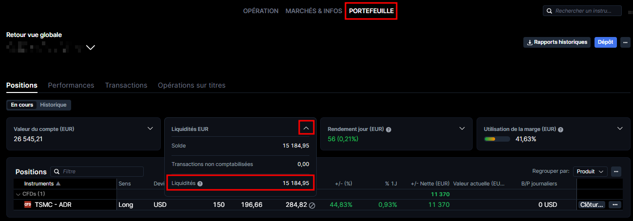 Les liquidités disponibles sont le montant que vous pouvez normalement utiliser pour négocier des produits au comptant, notamment des actions, des ETF et des options, et vous les trouverez sur la page "Portefeuille" de votre plateforme, mais une partie de ces liquidités peut encore être réservée.