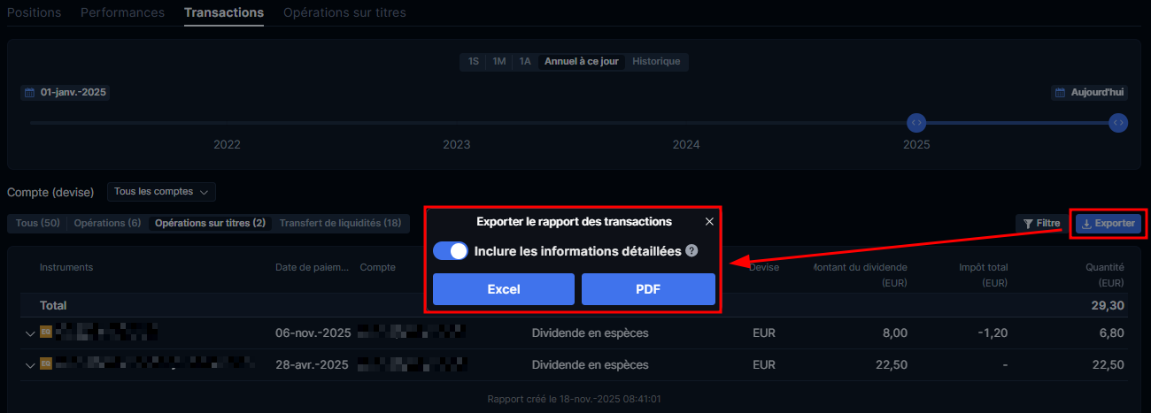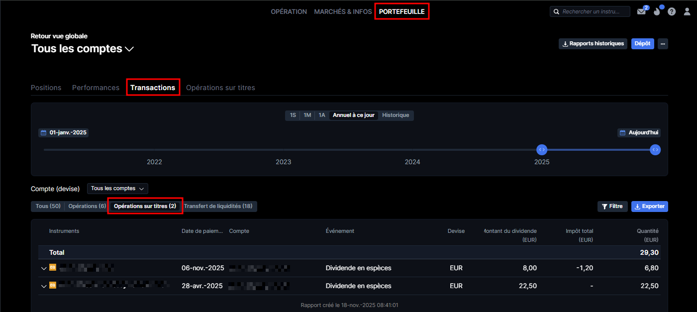Pour accéder au rapport sur les dividendes, allez dans Portefeuille > sélectionnez un compte > Transactions > Opérations sur titres