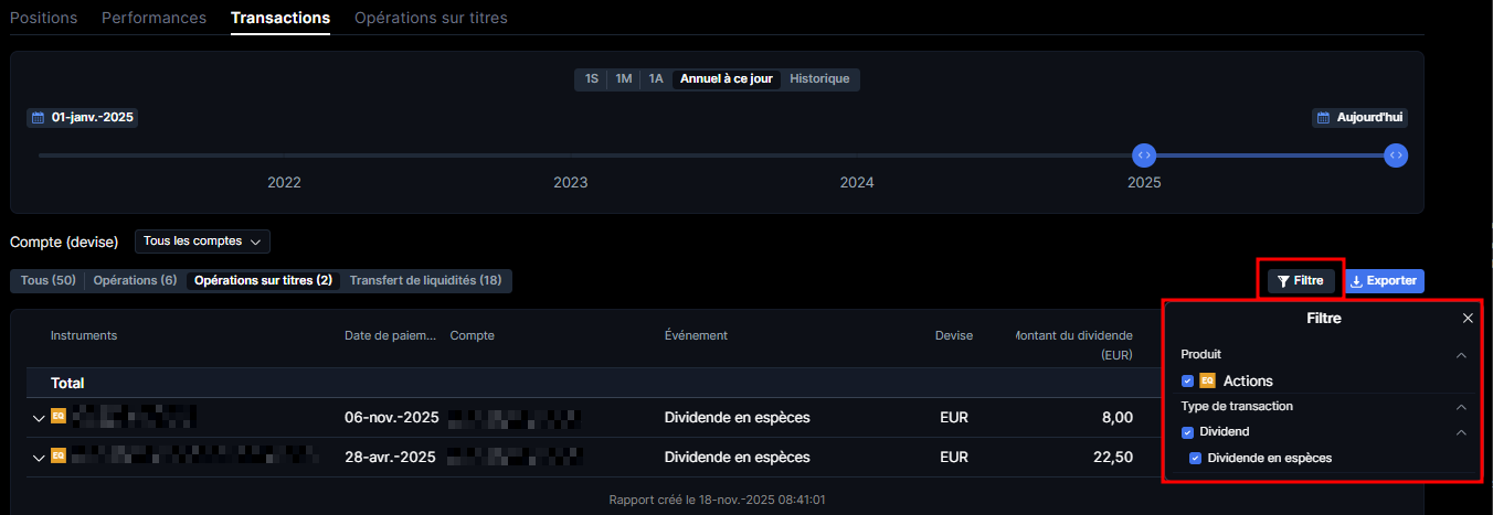Pour accéder aux opérations sur titres et aux dividendes, vous pouvez utiliser le filtre :