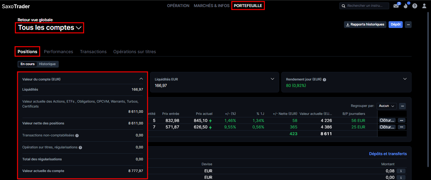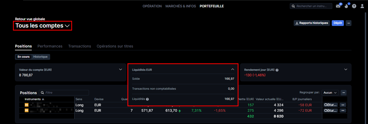 Vous pouvez trouver "Liquidités" sous "Portefeuille" en cliquant sur le compte concerné ou sur "Tous les comptes".