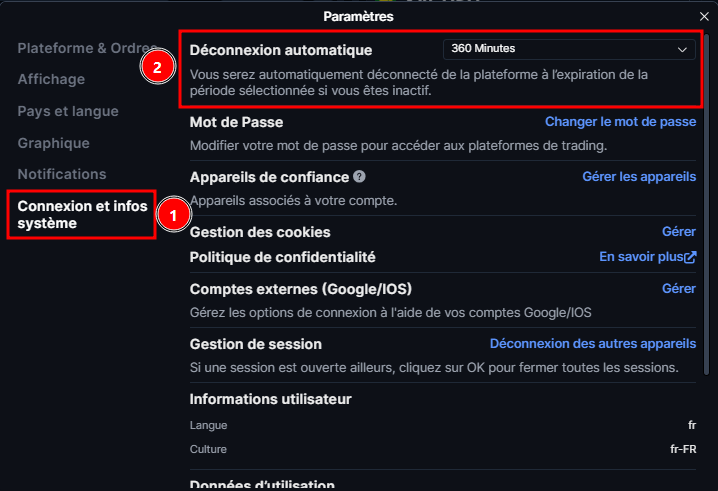 Pour ajuster les paramètres, accédez à Mon profil en cliquant sur l’icône > Personnalisation de la plateforme > Connexion et infos système > Déconnexion automatique