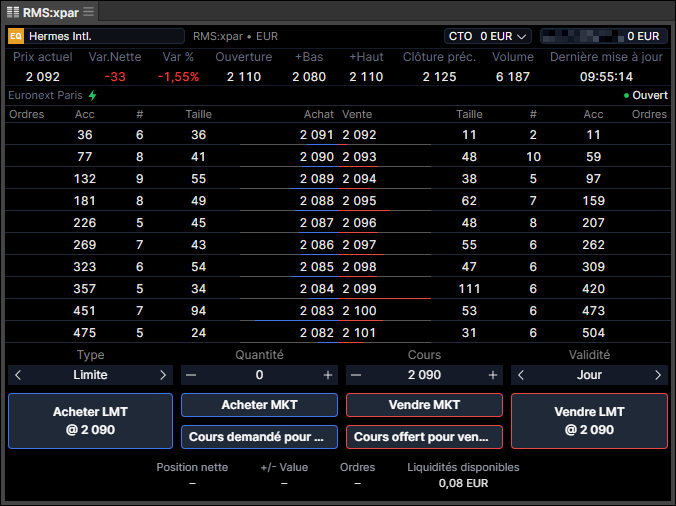 Depuis ce module, vous pourrez placer des ordres très rapidement et les modifier si besoin. Si vous détenez déjà une position sur le titres affiché, vous pourrez aussi visualiser votre Gains/Pertes en bas de la fenêtre.