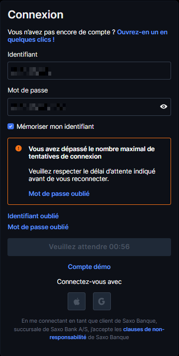 Après cinq tentatives infructueuses de connexion à votre compte Saxo (en saisissant un identifiant et/ou un mot de passe incorrect), vous verrez le message d’erreur suivant :