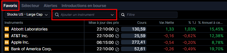 Une liste des favoris est une liste contenant les instruments tels que des actions, des ETF que vous souhaitez surveiller et dans lesquels vous souhaitez éventuellement investir.