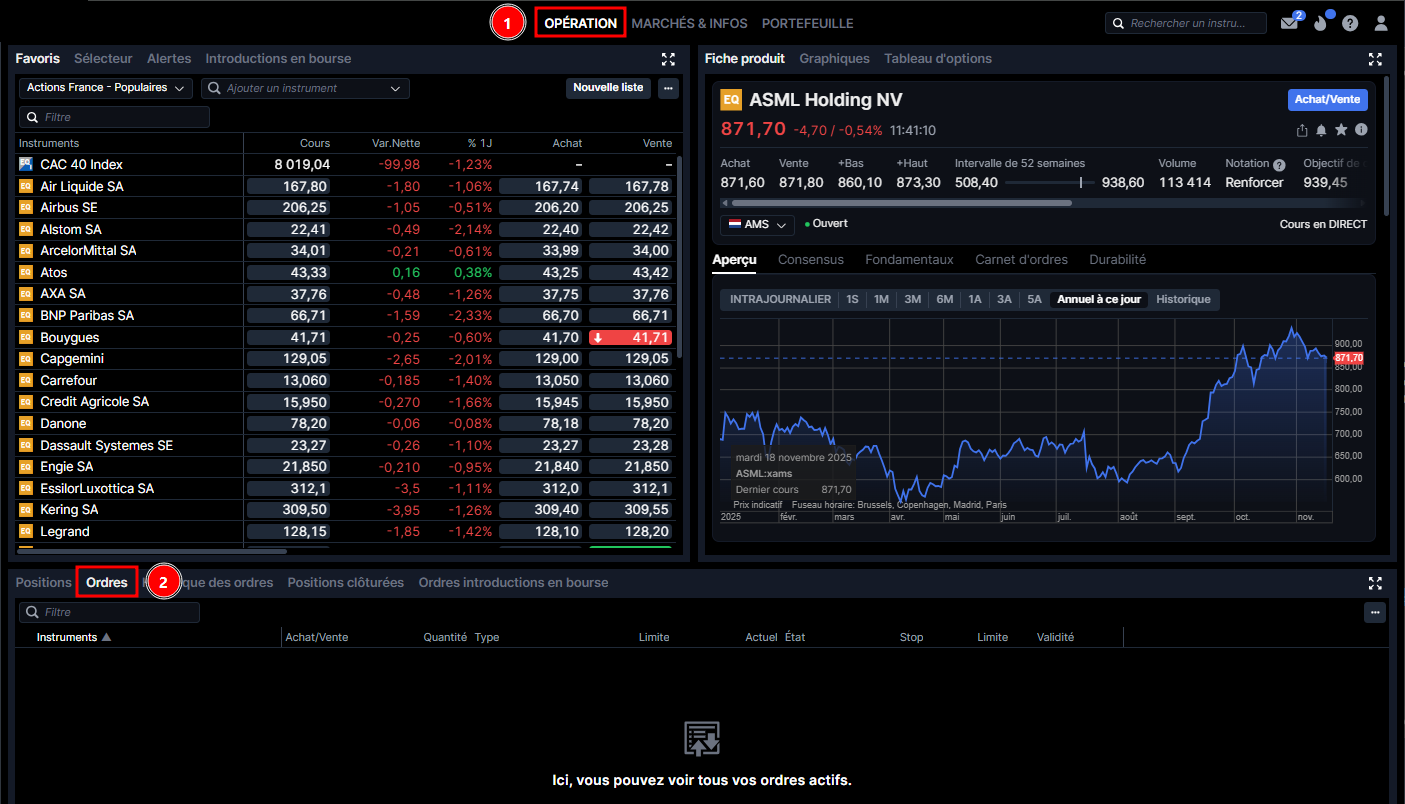 L’onglet des ordres présente une liste de vos ordres actuels et historiques. Vous pouvez y consulter le statut de vos ordres, les modifier ou les annuler.