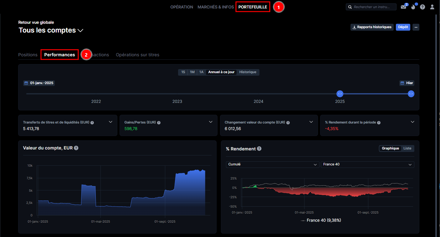 Retrouvez dans cette section la performance historique de votre compte, ajustable selon la période de votre choix. Vous pouvez voir l'évolution de la valeur et des rendements de votre compte dans deux graphiques. Vous pouvez comparer vos performances avec un benchmark. Vous pouvez également voir la ventilation des pertes et profits avec la possibilité de les regrouper par produit. En cliquant sur un instrument, vous pouvez voir la répartition des pertes et profits, obtenir plus d'informations sur les gains, les rendements et l'historique des transactions pour cet instrument.