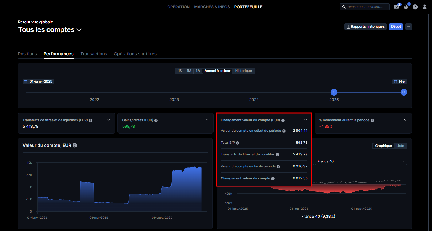 Le Total B/P correspond à la valeur du compte en fin de période ajustée en fonction de la valeur du compte en début de période et des variations résultant des transferts d'espèces et de titres. L'ajustement des transferts d'espèces et de titres permet une analyse des Bénéfices/Pertes sans tenir compte des entrées et sorties de capitaux qui peuvent gonfler ou diminuer le résultat observé au cours d'une période donnée, par exemple des dépôts d'espèces importants sur le compte ou des pertes résultant de retraits d'espèces.