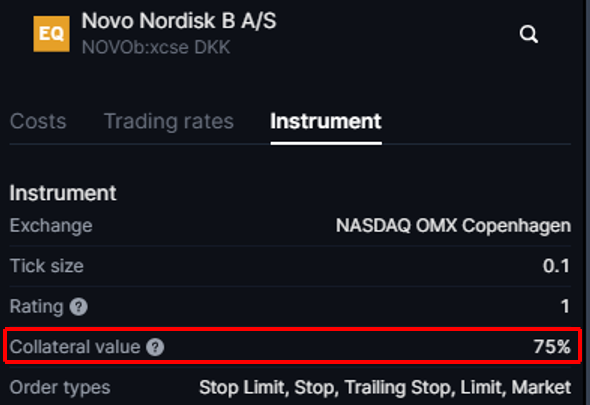 Naviga alle condizioni di contrattazione cliccando su "i" > Clicca sulla scheda Strumento > Visualizza il valore collaterale come mostrato di seguito: