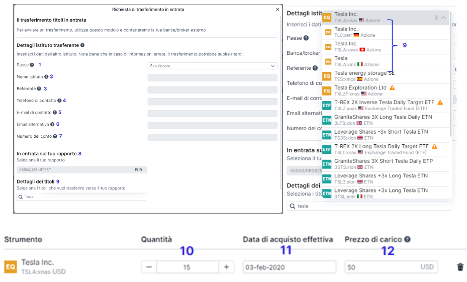 Selezionare i titoli da trasferire in entrata/uscita; in caso di trasferimento in entrata di titoli quotati su più mercati (esempio: Tesla, le cui azioni sono quotate su Nasdaq - USA, Xetra - Germania, SMI – Svizzera, Borsa Italiana – Italia) seleziona quello corretto |