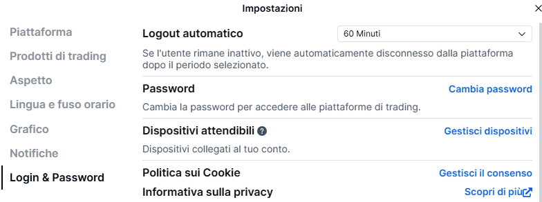 Sia BG SAXO Investor che BG SAXO Trader offrono la possibilità di personalizzare le impostazioni di logout automatico in base alle tue preferenze. Puoi modificare il periodo di inattività prima del logout, estendendolo fino a 360 minuti (6 ore) oppure riducendolo fino a un minimo di 5 minuti.