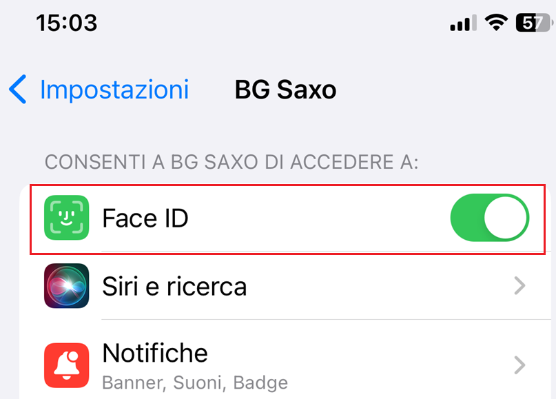 Se il Touch ID è abilitato nelle impostazioni di BG SAXO Trader, al primo accesso viene visualizzato il messaggio di cui sopra. Si può decidere di utilizzarlo o di mantenere la verifica standard inserendo l'ID utente e la password. È sempre possibile disattivarlo o attivarlo in un secondo momento, basta andare nelle Impostazioni dell'iPhone/iPad, cercare BG SAXO Trader e attivare o disattivare Face ID: