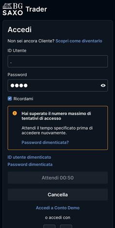 Dopo cinque tentativi non riusciti di accesso al tuo conto BG SAXO (inserendo un ID utente e/o una password errati), riceverai il seguente messaggio di errore e la relativa misura di sicurezza:
