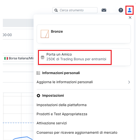 Per richiedere il link "Porta un Amico", accedi alle piattaforme BG SAXO e clicca sul menu > Porta un Amico.