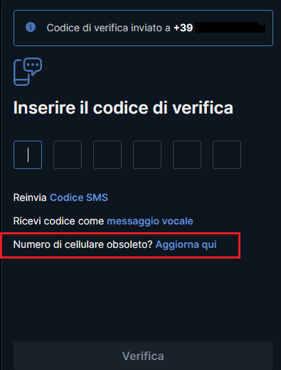 - Se rileviamo che stai accedendo da un dispositivo non attendibile, ti verrà chiesto di inserire un codice SMS, che verrà inviato al numero di telefono associato al tuo conto. (Hai cambiato numero di telefono?)