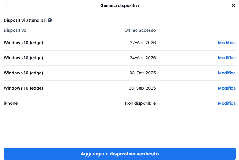 Una volta salvato un dispositivo come attendibile, non sarà necessario completare l’autenticazione a due fattori a ogni accesso da quel dispositivo. Il tuo rapporto rimane protetto, mentre l’esperienza di login diventa più veloce e comoda.