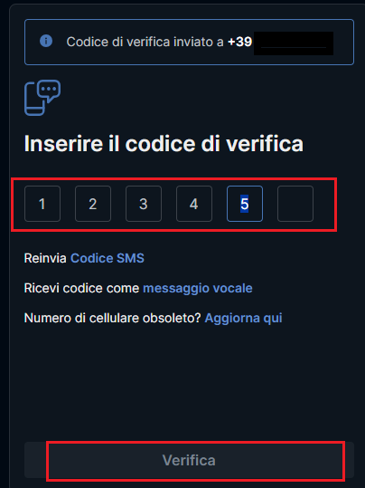Inserisci il codice SMS ricevuto e clicca su Verifica.