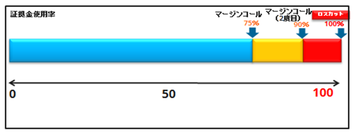 証拠金使用率が100%に達する前に、使用率が一定水準に到達すると、マージンコール(証拠金使用率通知)が発動し、ご登録メールなどに証拠金使用率の警告が通知されます。