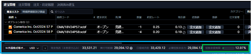 証拠金取引(FX/CFDなど)では、サブ口座の証拠金使用率が100%になった時点で、該当口座の建玉強制決済や未約定注文のキャンセルがなされます。証拠金使用率とは、必要証拠金 ÷(口座純資産-証拠金に使用できない金額)で計算され、取引ツールの建玉管理画面下部で確認することができます。建玉やマーケットの状況によっては、数時間で証拠金使用率が大幅に上昇しロスカットが発動する場合もございますので、強制決済を避けるためには、現金残高に十分な余裕をもって取引することが必要です。