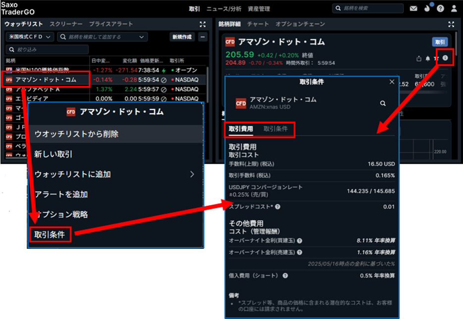 SaxoTraderPROの場合、メニューからも「取引条件」を確認できます。